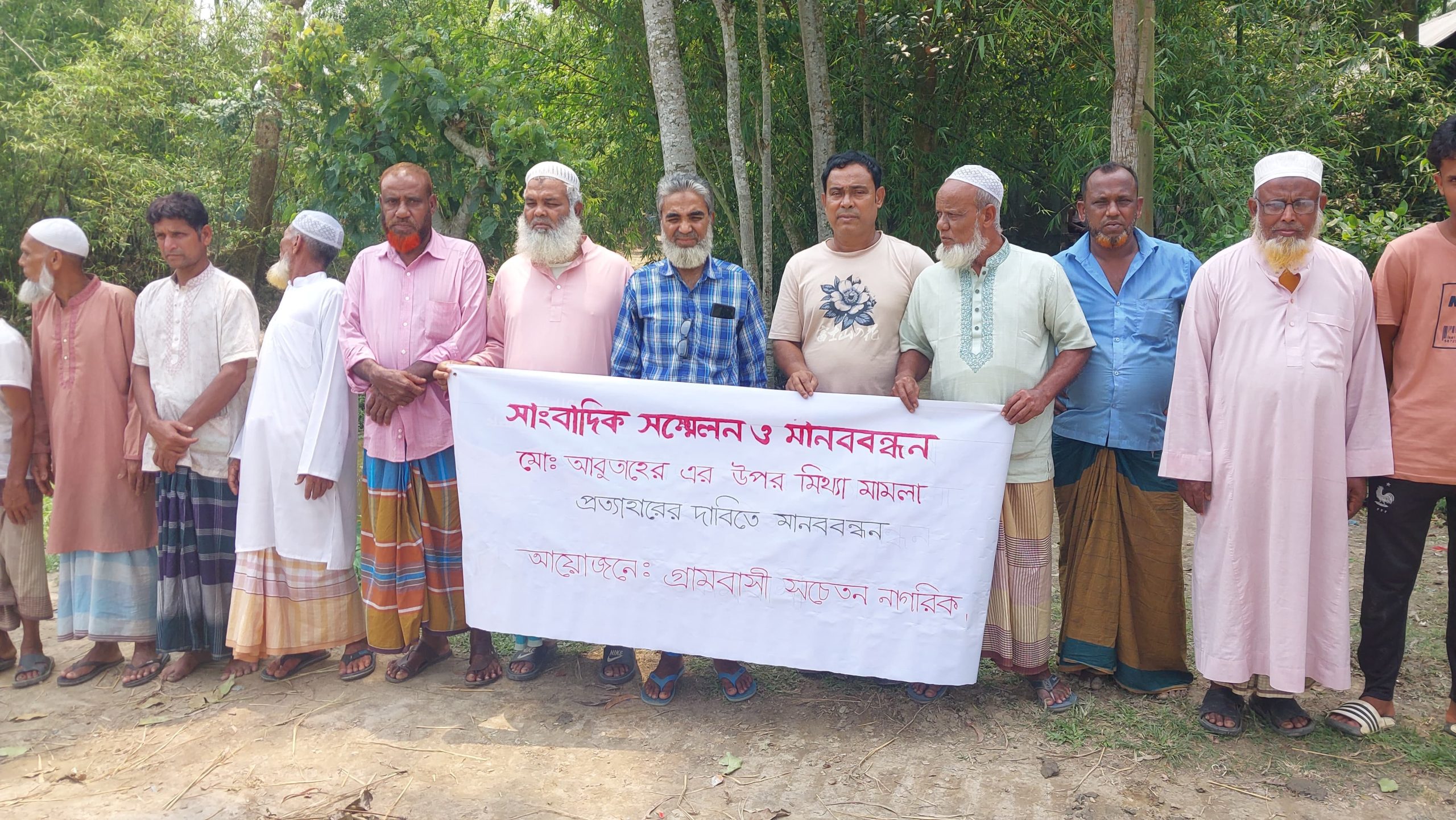 শ্যামারগাঁও গ্রামের মানুষ নিরীহ আবু তাহেরের উপর দায়েরকৃত মামলার সুষ্ঠু নিরপেক্ষ ও মামলা প্রত্যাহার করার জন্য দাবী জানান। অনুষ্ঠিত মানববন্ধনে বক্তব্য রাখেন, শ্যামারগাঁও গ্রামের বিশিষ্ট মুরব্বি হাজী হাসান মিয়া, মাওলানা তবারক আলী, মাওলানা এহিয়া আহমদ, মাওলানা জুনেদ আহমদ, বিলাল আহমেদ, শামীম আহমদ, শায়েস্তা মিয়া প্রমুখ। অনুষ্ঠিত মানববন্ধনে শ্যামারগাঁও গ্রামের বিশিষ্ট ব্যক্তিবর্গ সহ শতাধিক জনসাধারণ উপস্থিত ছিলেন।