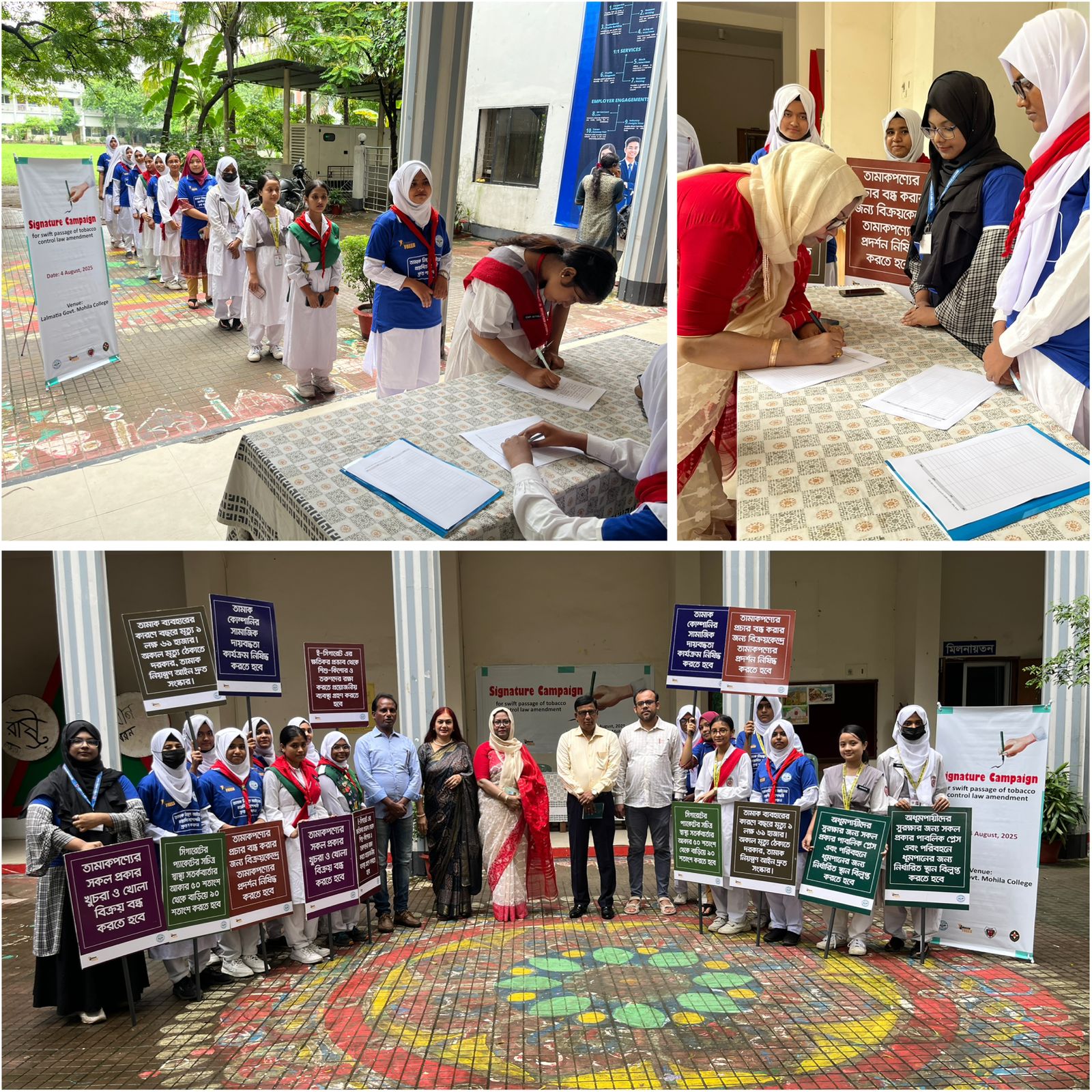 তামাক নিয়ন্ত্রণ আইনের প্রস্তাবিত সংশোধনী দ্রুত পাসের দাবি জানিয়েছে লালমাটিয়া মহিলা কলেজের সহস্রাধিক শিক্ষার্থী। আজ সোমবার (৪ আগস্ট) কলেজ প্রাঙ্গণে নারী মৈত্রী ও লালমাটিয়া মহিলা কলেজ রেঞ্জার গ্রুপের যৌথ উদ্যোগে "তামাক নিয়ন্ত্রণ আইনের প্রস্তাবিত সংশোধনী দ্রুত পাসের দাবি" শিরোনামের দিনব্যাপী সিগনেচার ক্যাম্পেইনে সহস্রাধিক শিক্ষার্থী স্বাক্ষর দিয়ে আইনটি শক্তিশালী করার পক্ষে নিজেদের দৃঢ় অবস্থান প্রকাশ করে। আয়োজকদের পক্ষ থেকে জানানো হয়, এই স্বাক্ষরসমূহ প্রধান উপদেষ্টার দপ্তরে জমা দেওয়া হবে, যাতে দ্রুত সংশোধনী পাসের জন্য নীতিনির্ধারকদের দৃষ্টি আকর্ষণ করা যায়। ক্যাম্পেইনের উদ্বোধন করেন লালমাটিয়া মহিলা কলেজের অধ্যক্ষ প্রফেসর জাহানারা জামান।