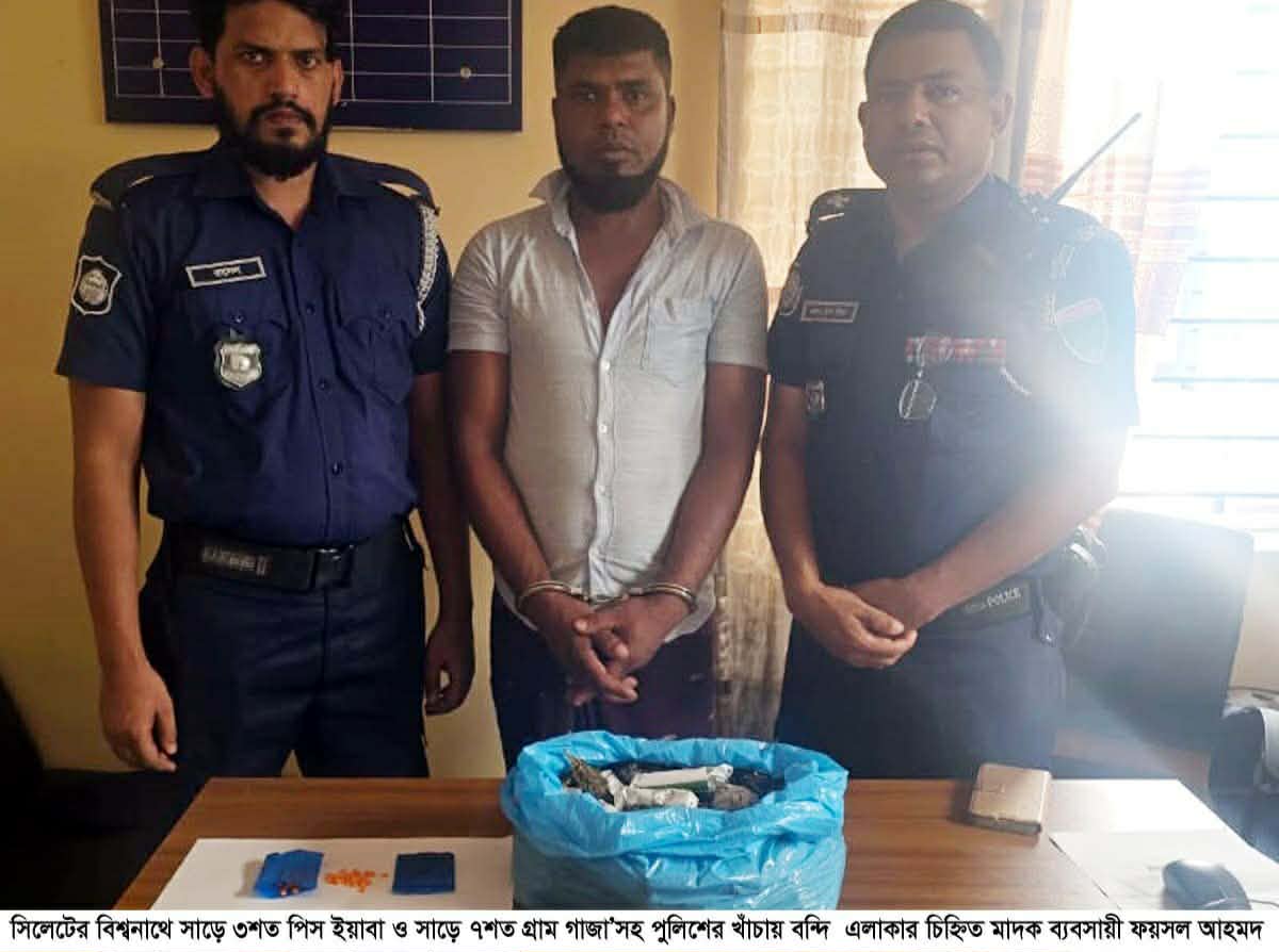 সাড়ে ৩শত পিস ইয়াবা ও সাড়ে ৭শত গ্রাম গাজা’সহ সিলেটের বিশ্বনাথে পুলিশের খাঁচায় বন্দি হয়েছে এলাকার চিহ্নিত মাদক ব্যবসায়ী ফয়সল আহমদ (৩৫)। মাদক ব্যবসায়ী ফয়সল উপজেলার রামপাশা ইউনিয়নের রামচন্দ্রপুর গ্রামের ওয়ারিছ আলীর পুত্র। শনিবার (২৫ এপ্রিল) দুপুর সাড়ে ১২টার দিকে গোপন সংবাদের ভিত্তিতে অভিযান চালিয়ে মাদক ব্যবসায়ী ফয়সলের নিজ বসতঘর থেকে মাদক’সহ তাকে আটক করে থানায় নিয়ে আসে পুলিশ। আটককৃত মাদক ব্যবসায়ী ফয়সলের বিরুদ্ধে দেশের বিভিন্ন থানায় আরোও একাধিক মামলা রয়েছে বলে জানিয়েছে পুলিশ। পুলিশ সূত্রে জানা গেছে, গোপন সংবাদের ভিত্তিতে বিশ্বনাথ থানার অফিসার ইন-চার্জ (ওসি) গাজী মাহবুবুর রহমানের নেতৃত্বে এএসআই ফুল মিয়া’সহ পুলিশের একটি দল রামচন্দ্রপুর গ্রামস্থ মাদক ব্যবসায়ী ফয়সল আহমদের নিজ বসতঘরে অভিযান পরিচালনা করেন। এসময় তল্লাসী করে ফয়সলের বসতঘর থেকে পুলিশ সাড়ে ৩শত পিস ইয়াবা ও সাড়ে ৭শত গ্রাম গাঁজা উদ্ধার করা হয়। মাদক ব্যবসায়ী ফয়সলকে মাদক’সহ আটক করে থানায় নিয়ে আসার পর তাকে (ফয়সল) অভিযুক্ত করে ‘মাদকদ্রব্য নিয়ন্ত্রণ আইনে’ বিশ্বনাথ থানার এএসআই ফুল মিয়া বাদী হয়ে থানায় একটি মামলা দায়ের করেন। মামলা নং ১৭ (তাং ২৫.০৪.২৬ইং)। এরপর এমামলায় তাকে গ্রেপ্তার দেখিয়েছে পুলিশ। সাড়ে ৩শত পিস ইয়াবা ও সাড়ে ৭শত গ্রাম গাজা’সহ এলাকার চিহ্নিত মাদক ব্যবসায়ী ফয়সল আহমদকে গ্রেপ্তারের সত্যতা স্বীকার করে বিশ্বনাথ থানার অফিসার ইন-চার্জ (ওসি) গাজী মাহবুবুর রহমান বলেন, গ্রেপ্তারকৃত ফয়সল এলাকার একজন চিহ্নিত মাদক ব্যবসায়ী। তার বিরুদ্ধে পুলিশ বাদী হয়ে একটি মামলা দায়ের করেছে। এছাড়াও তার বিরুদ্ধে আরোও একাধিক মামলা রয়েছে। আজ রোববার তাকে আদালতে প্রেরণ করা হবে।