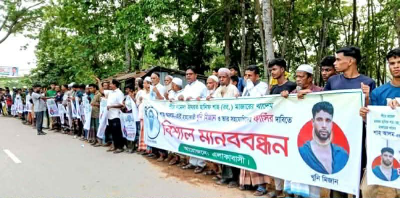 সিলেটের বিশ্বনাথে পীরে কামিল হযরত হানিফ শাহ (রহ.) মাজারের খাদেম শাহ আলম হত্যা মামলার মূল অভিযুক্ত মিজানুর রহমান মিজান ও তার সহযোগিদের ফাঁসির দাবিতে আজ রবিবার বিকেলে মানববন্ধন করেছে স্থানীয় এলাকাবাসী। বিশ্বনাথ-রামপাশা-লামাকাজি সড়কের ধলিপাড়া পিছের মুখে ওই মানববন্ধন অনুষ্ঠিত হয়। ধলিপাড়া (মাঝপাড়া) গ্রামের মুরব্বী লাল মিয়ার সভাপতিত্বে ও বিশ্বনাথ উপজেলা যুবদলের সদস্য শিহাব উদ্দিনের পরিচালনায় মানববন্ধন পূর্ব আলোচনা সভায় প্রধান অতিথির বক্তব্য রাখেন বিশ্বনাথ উপজেলা বিএনপির সিনিয়র সদস্য খছরুজামান খছরু। বিশেষ অতিথির বক্তব্য রাখেন জমসেরপুর গ্রামের মুরব্বী মানিক মিয়া, ধলিপাড়া গ্রামের মুরব্বী চেরাগ আলী, ধলিপাড়া মাঝপাড়া গ্রামের মুরব্বী আছদ্দর আলী। এসময় এলাকার মুরব্বীয়ান ও বিপুল সংখ্যক যুবকেরা উপস্থিত ছিলেন। মানববন্ধন পূর্ব আলোচনা সভায় বক্তারা, সরকার ও প্রশাসনের কাছে খুনি মিজান ও তার সহযোগীদের বিচারের আওতায় এনে দ্রুত ফাঁসি দাবি করেন এলাকাবাসী। উল্লেখ্য, গত ১৫ এপ্রিল রামাপাশা ইউনিয়নের ধলিপাড়া গ্রামের বশির উদ্দিনের ছেলে মিজানুর রহমানের কুড়ালের কুপে নিহত হন খাজাঞ্চি ইউনিয়নের প্রতাবপুর গ্রামের মৃত: ছিফত আলীর পুত্র শাহ আলম। শাহ আলম হত্যাকান্ডে বৃহস্পতিবার রাতে মামলা দায়ের করেন নিহতের ভাই শাহজাহান আহমদ। যার মামলা নং ১২।